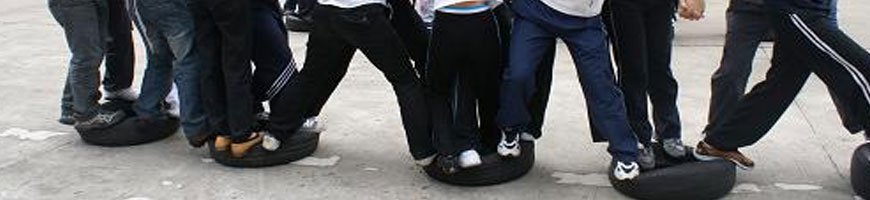 每個隊利用手中僅有的幾個輪胎,全隊人員一次性通過一段大約十幾米的距離,在過程當中,任何人的身體任何部位不可以觸地。