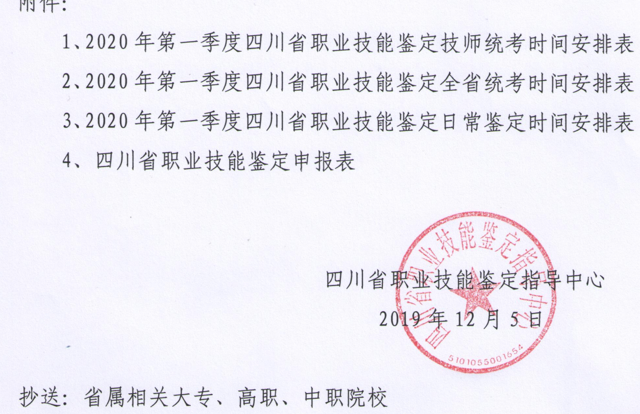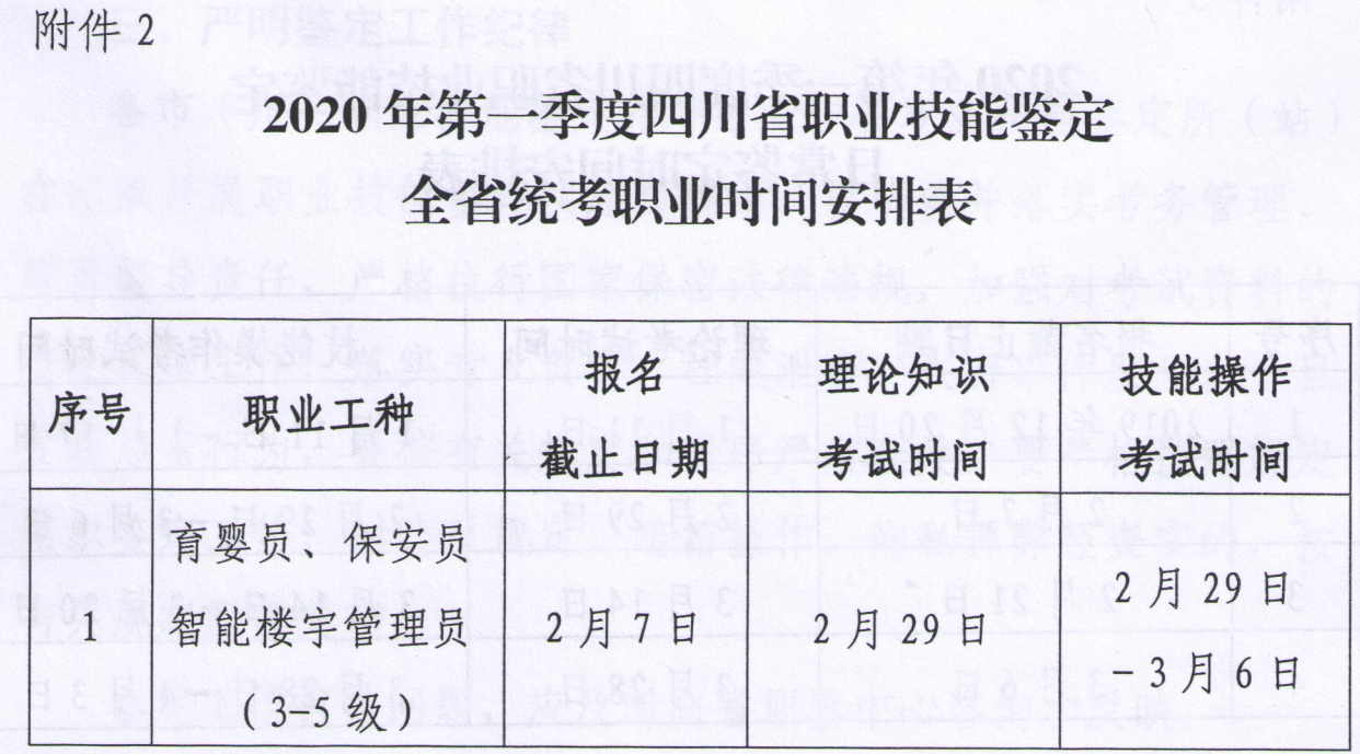四川省集中統(tǒng)一開展職業(yè)技能鑒定的實施情況和相關(guān)要求,2020年第一季度集中統(tǒng)一開展職業(yè)技能鑒定時間公布。鑒定的職業(yè)范圍、職業(yè)標(biāo)準(zhǔn)按國家最新公布的職業(yè)范圍和職業(yè)標(biāo)準(zhǔn)執(zhí)行。